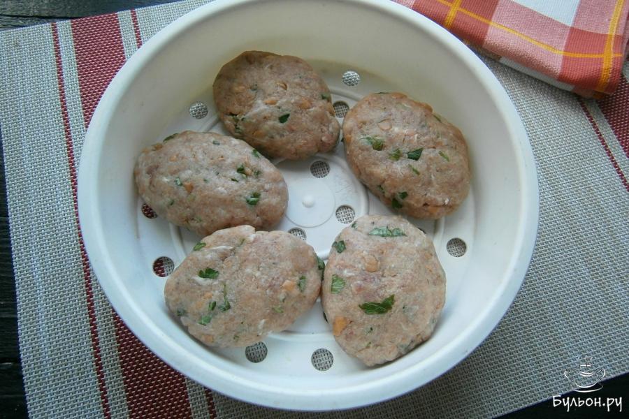 8. Сформировать из полученного фарша среднего размера котлетки, разместить их в паровой чаше (я котлеты готовила в мультиварке). В нижнюю чашу налить воды на треть объема, сверху - чаша с котлетами. Поставить все в мультиварку, накрыть крышкой и выставить режим "Готовка на пару" на 45 мин.