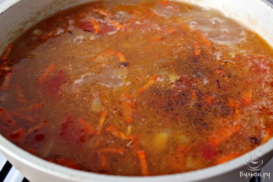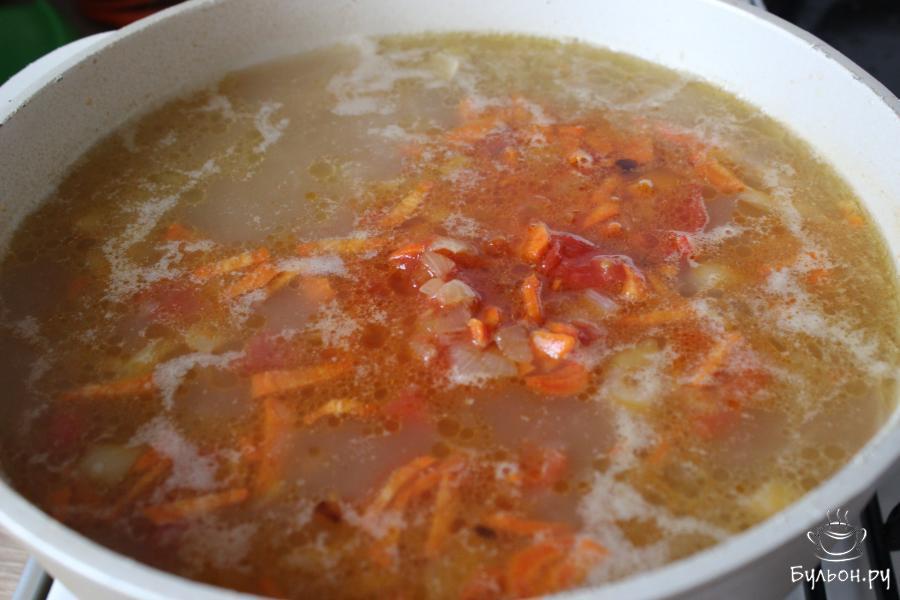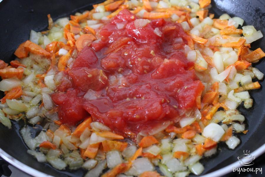 6. Лук порезать кубиками, морковь соломкой. Обжарить овощи на растительном масле. Добавить томаты в собственном соку или пару столовых ложек томатной пасты.