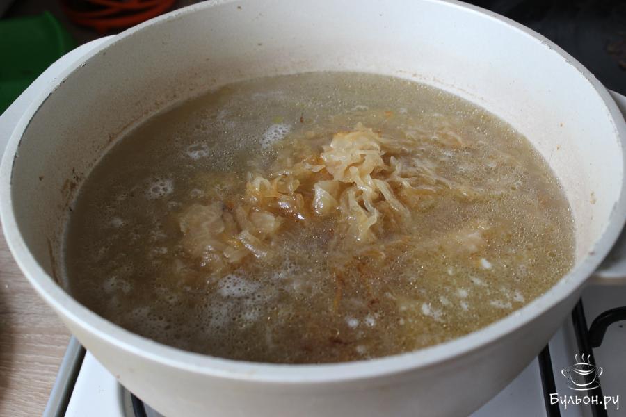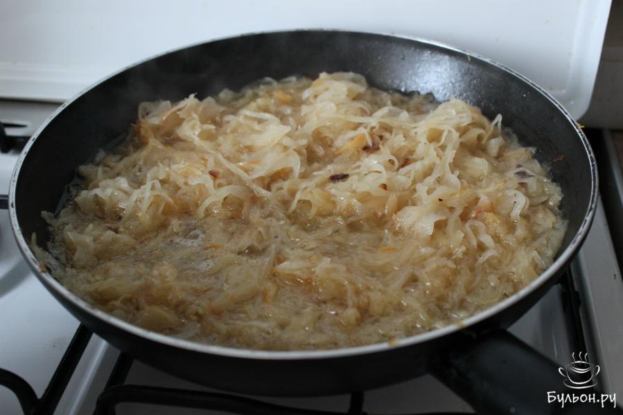 4. На сковороду выложить квашеную капусту. Из кастрюли добавить пару половников бульона. Тушить капусту до желаемой степени мягкости.