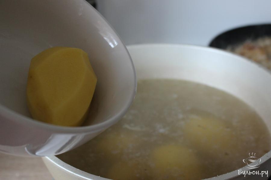 5. Когда бульон с перловой крупой закипит, добавить целый очищенный картофель. Варить до готовности картофеля.