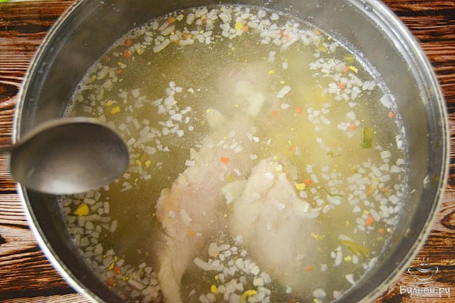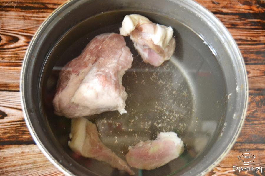 2. Начнем с приготовления бульона. Свинину сложим в чашу мультиварки, наполним водой. Установим программу Суп с температурой 100 градусов или чуть выше на 50 минут.