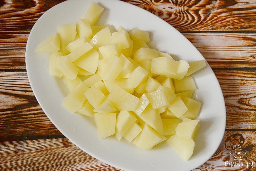 5. По сигналу мультиварки об окончании предыдущей программы, добавим в чашу картофель, сухой лук и сушеную морковь. Продолжим варку на программе Суп. Установим на 30 минут.