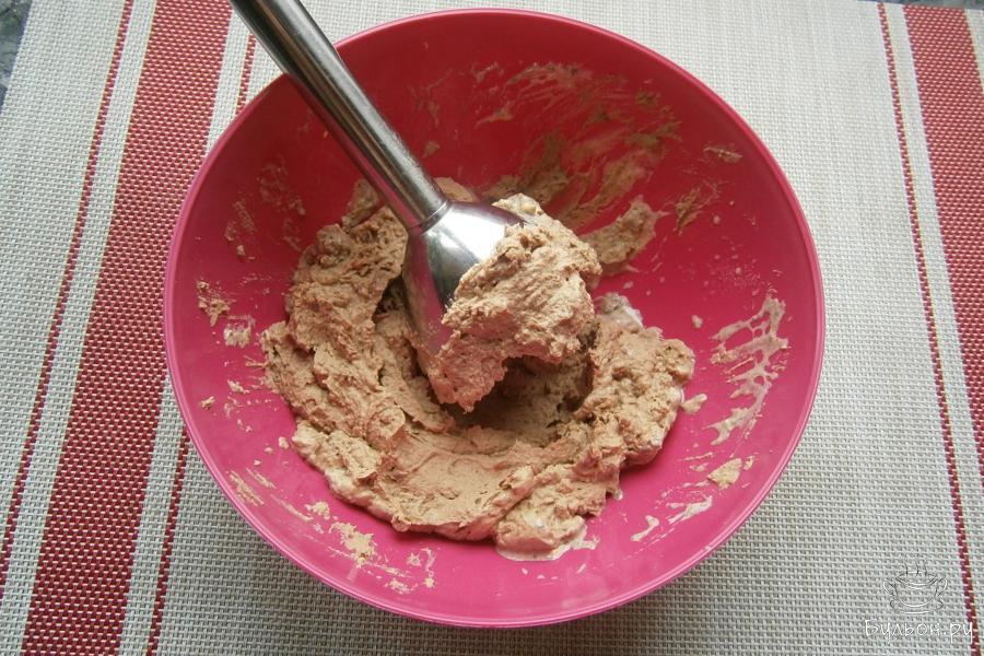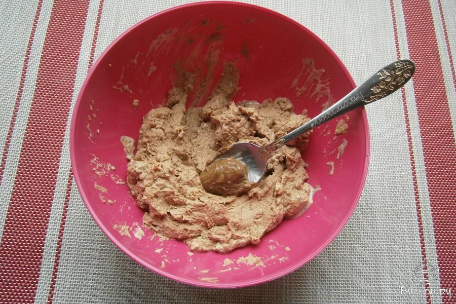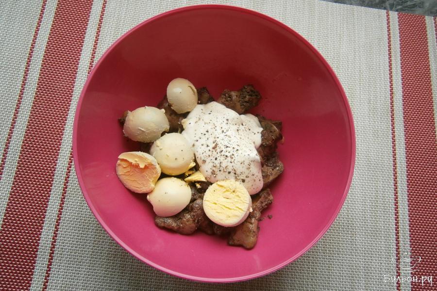 4. Остывшую печенку поместить в миску, добавить яичные желтки, соль, несколько ложек майонеза и поперчить.