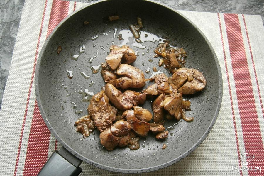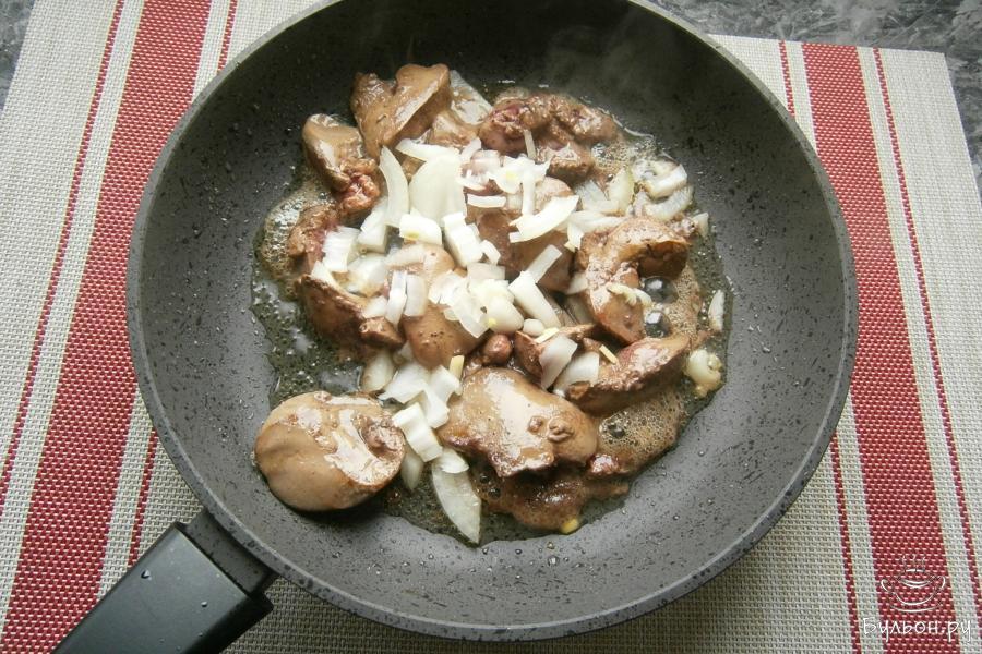 1. Куриную печень помыть, обсушить, обжарить минуты 3-4 на растительном масле. после чего, добавить порезанный репчатый лук.