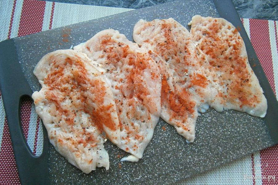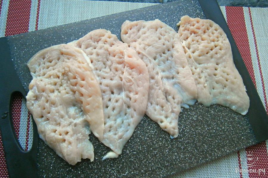 1. У целой куриной грудки удалить кость, разрезать филе, как на отбивные, на 4 части, отбить немного молоточком.