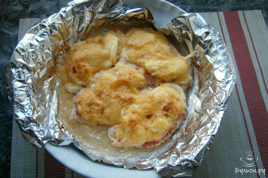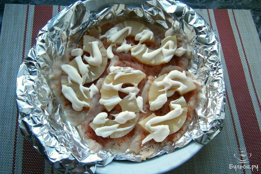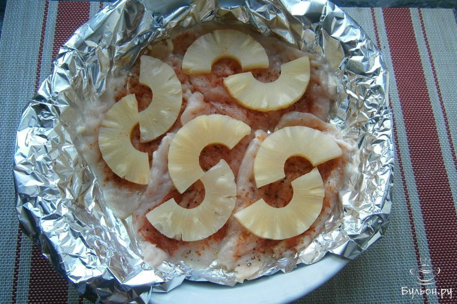3. Форму застелить фольгой или пергаментом, смазать дно растительным маслом. Выложить ломти курицы. Кольца консервированных ананасов разрезать на 2 части, выложить их на мясо.