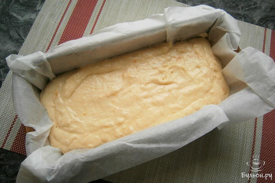 9. Форму для кекса (у меня размер - 25х12 см) застелить пергаментом и выложить тесто. Поместить форму в разогретую до 170 град. духовку на 1 час.