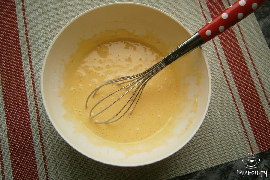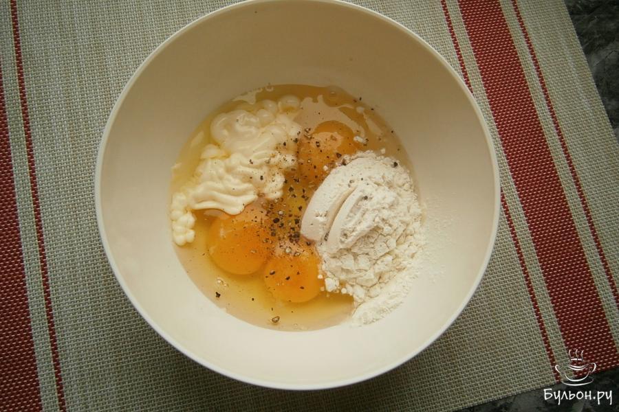 1. Яйца разбить в миску, добавить 3 ст. л. майонеза, щепотку соли, всыпать муку и немножко черного перца.
