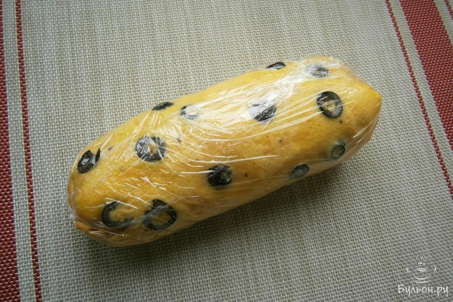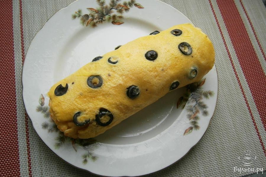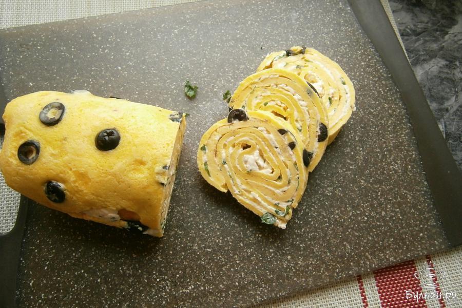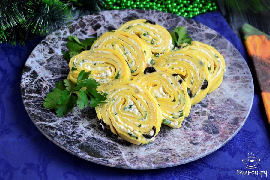 11. Остальные блинчики, также, смазать сырной массой и разместить их один на другой, а затем, выложить на нижний блинчик с оливками. Все свернуть в плотный рулет.