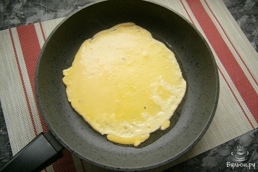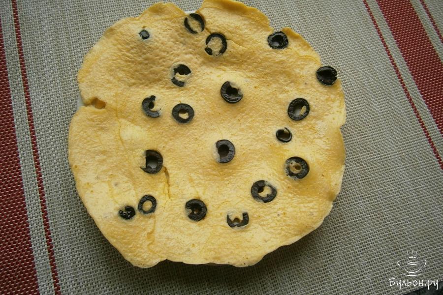 5. Залить оливки частью яичной смеси (блинчик должен получиться тонким). Жарить его на огне до легкой румяности, затем, перевернуть и жарить буквально несколько секунд. Блинчики должны оставаться желтого цвета, без поджаристой корочки.