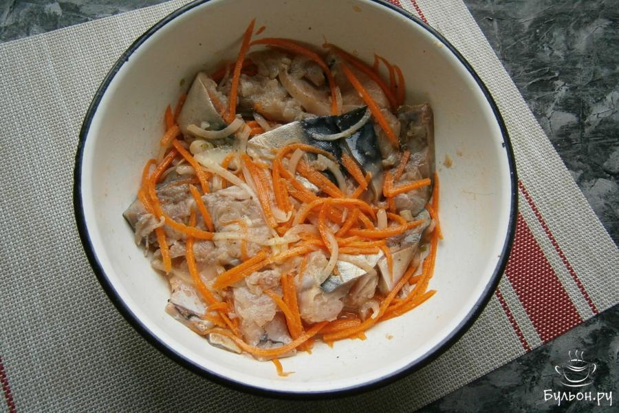 7. Залить остывшим маринадом рыбу с овощами, перемешать, придавить любой подходящей тарелочкой и поставить сверху небольшой гнет. Оставить рыбку для маринования на 30 минут.