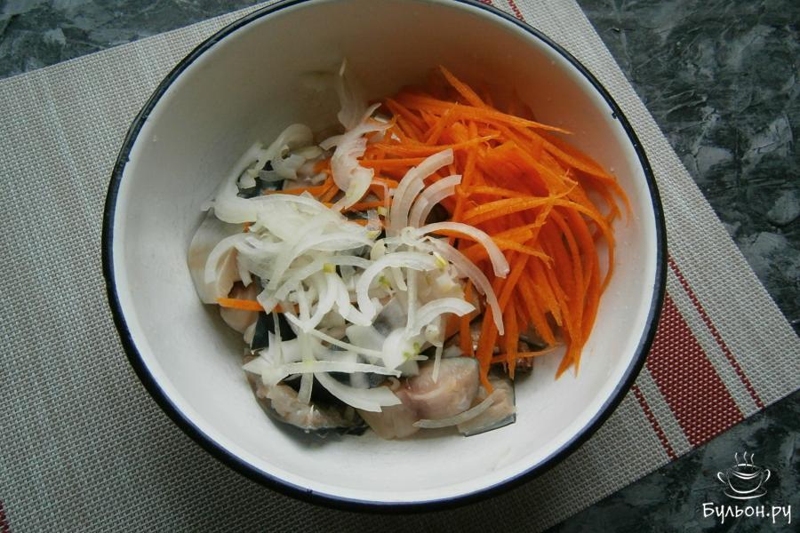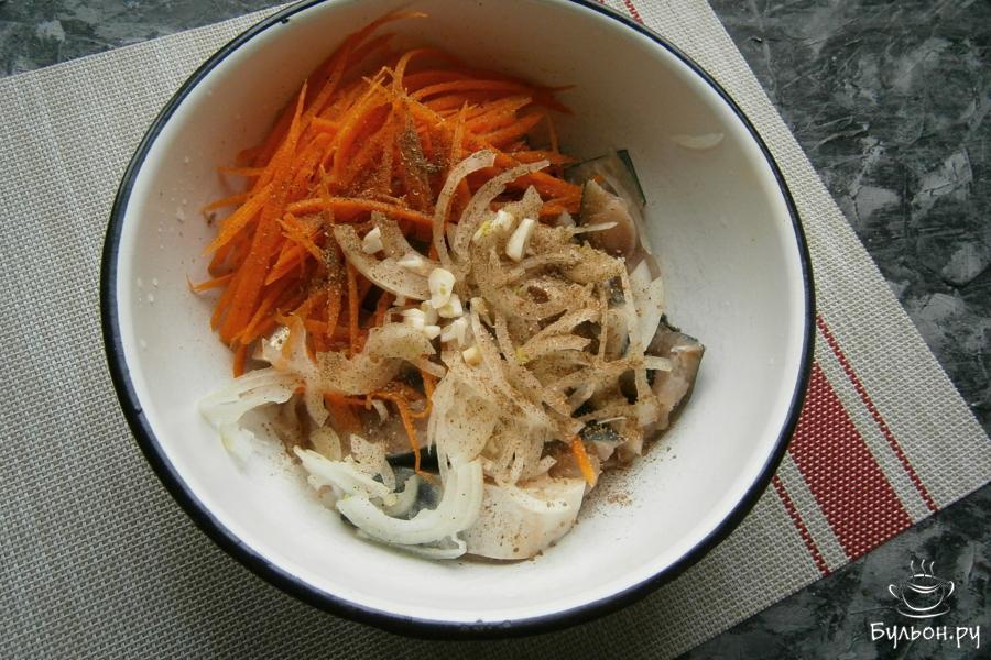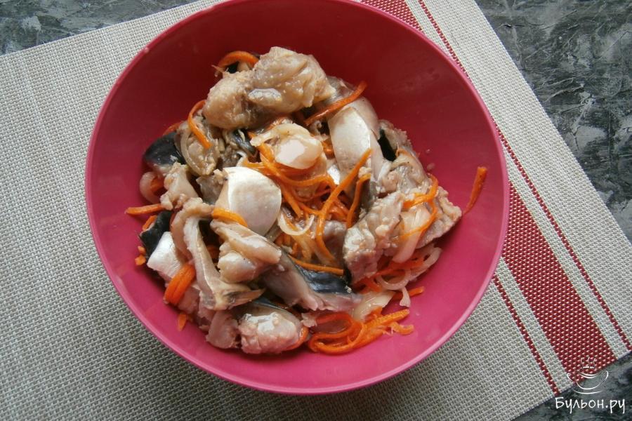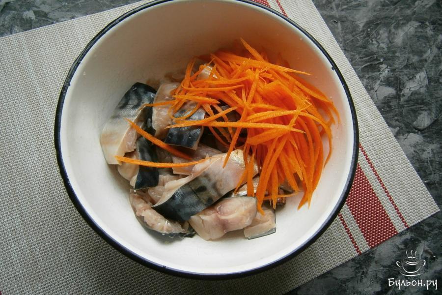 3. Далее, рыбу тщательно промыть проточной водой, обсушить и добавить к ней натертую, желательно, на корейской терке.