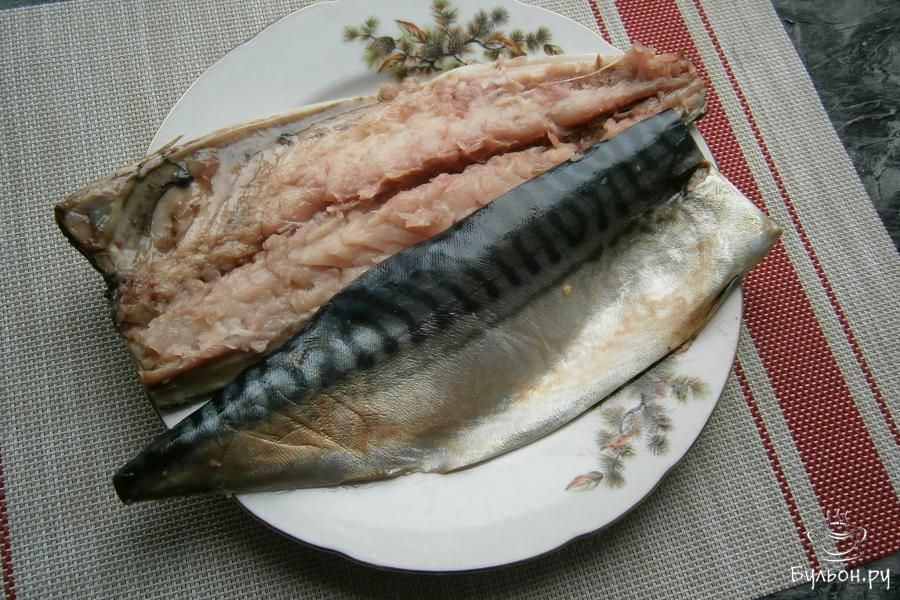 1. Скумбрию, если она была заморожена - разморозить. Удалить у рыбы хвост и голову, убрать внутренности, хорошо промыть. Разрезать скумбрию вдоль на 2 части, удалить полностью хребет и по-максимуму - косточки.