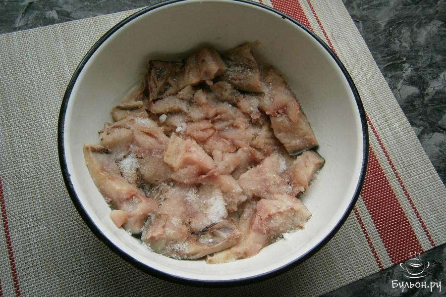 2. Порезать рыбу на кусочки, сложить в миску одним слоем, кожицей вниз. Посыпать скумбрию 1 ст. л. крупной каменной соли. Прикрыть рыбу крышкой и оставить на 2 часа.