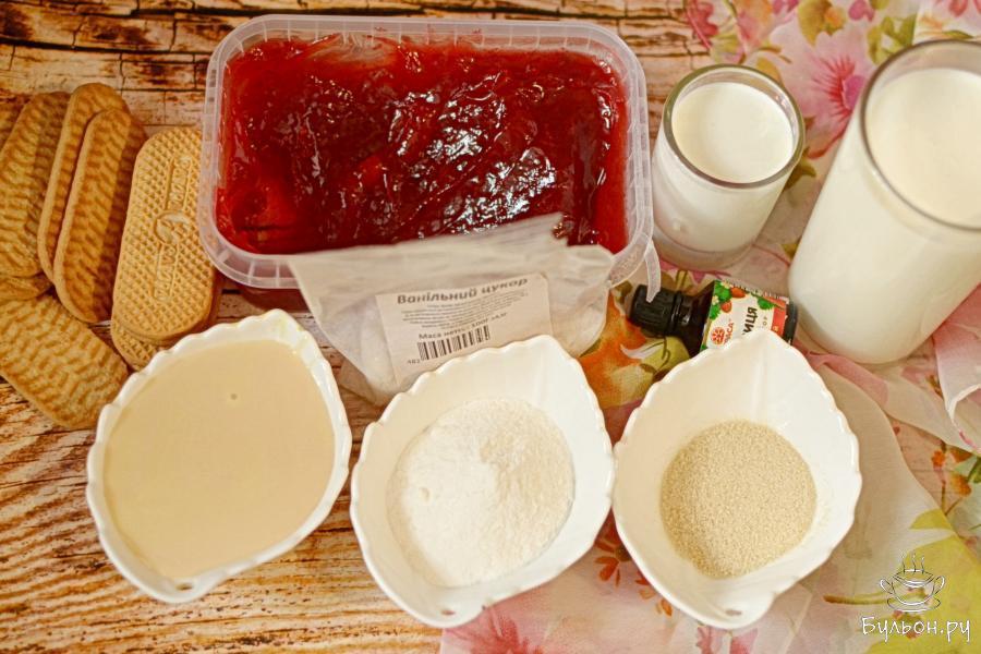 Самые простые муссовые пирожные можно приготовить из сливок и сгущенки. В этом рецепте нам не надо будет растапливать белый шоколад или проваривать яичную массу. Во взбитые сливки мы просто добавим сгущенку и фруктово-ягодный наполнитель на свой вкус. Сегодня в качестве наполнителя я использую густой клубничный джем, можно же использовать любой джем или варенье на свой вкус, а также свежие фрукты и ягоды. Сливки нам обязательно понадобятся жирные, жирность должна быть не меньше 30%, тогда они хорошо взобьются. Другое требование к сливкам - они должны быть холодными.