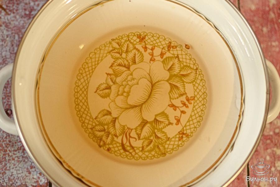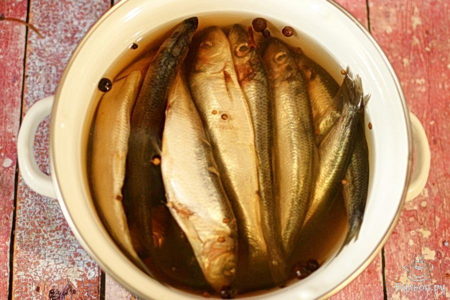 3. Мы видим, что цвет нашей жидкости изменился - немного потемнел. Остудим рассол, сложим в него рыбу так, чтобы она была полностью погружена в жидкость, прикроем гнетом.