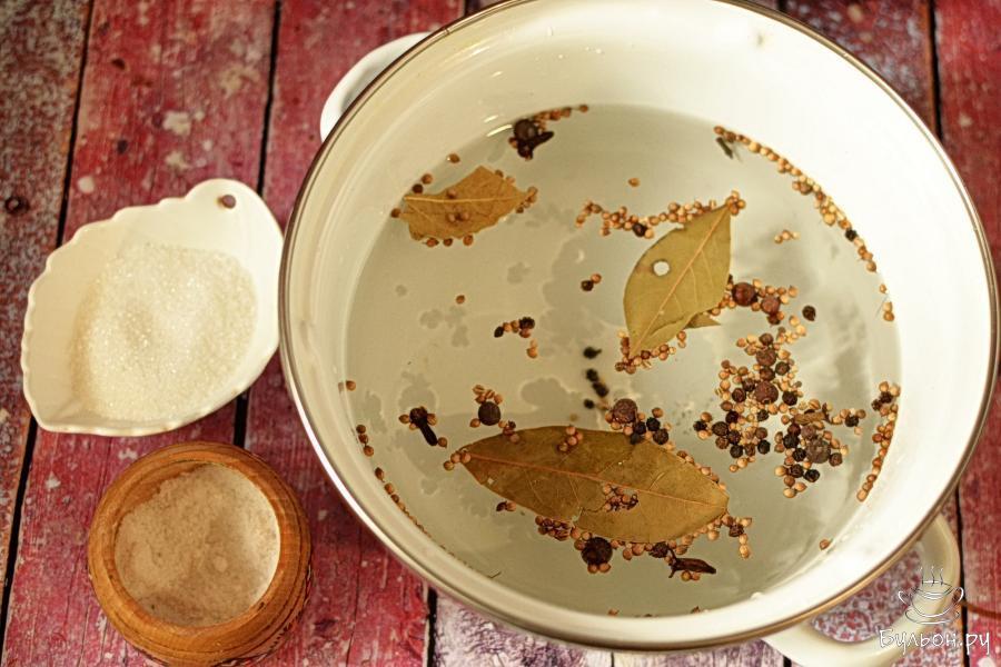 2. Приготовим рассол для рыбы. В литр воды сложим специи, соль и сахар. Поставим на огонь и вскипятим.