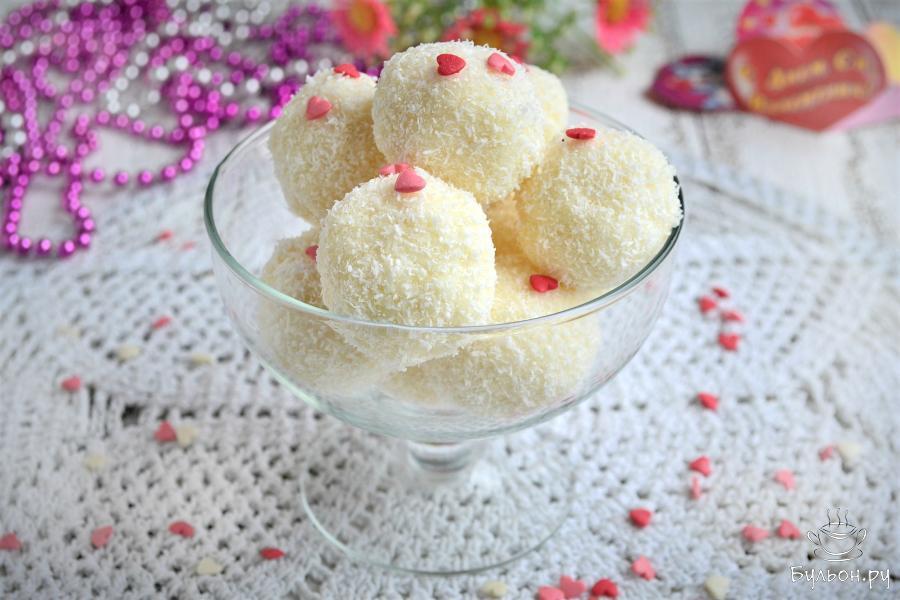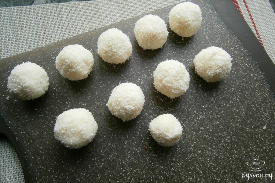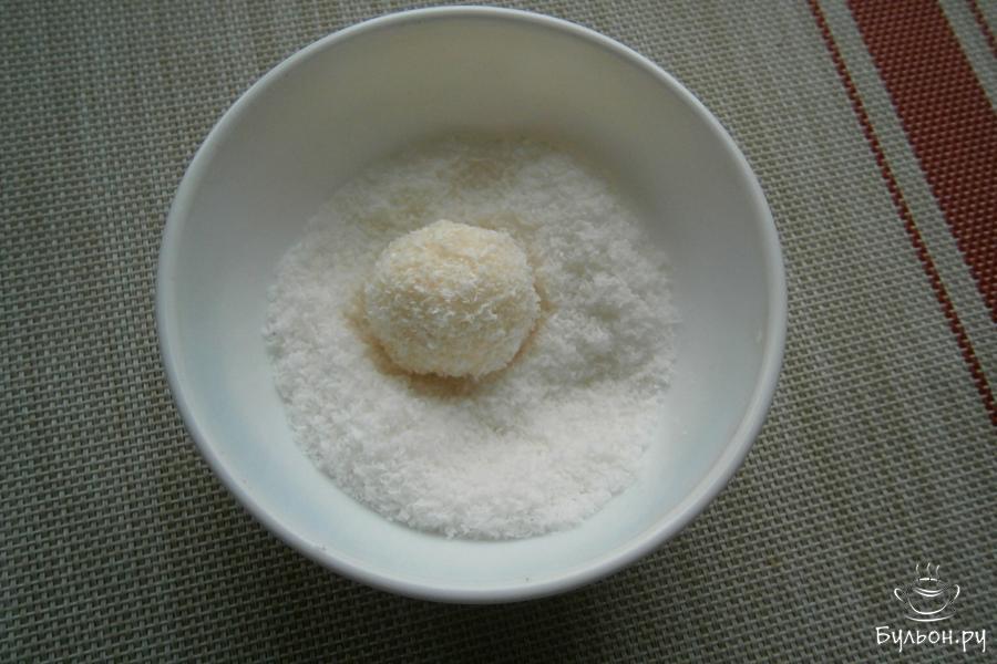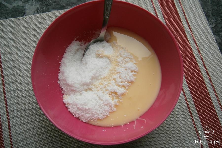 1. Сгущенное молоко самого высшего качества вылить в миску, добавить 80 г кокосовой стружки (остальную оставить для украшения шариков).