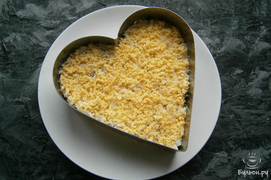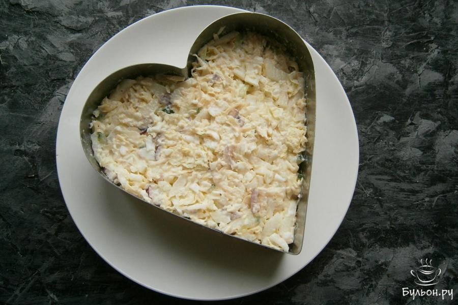 5. Салатик перемешать и выложить его на плоскую тарелку, формируя с помощью кольца (у меня - сердце). Все немного утрамбовать, но без фанатизма, салат должен остаться воздушным.