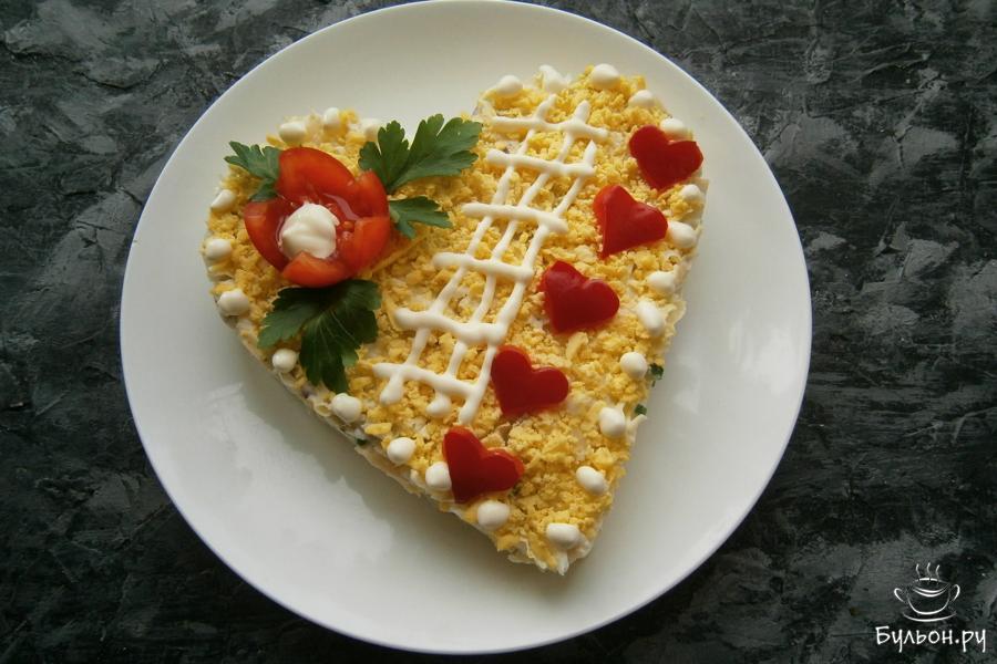 7. Кольцо аккуратно убрать, а салат украсить цветком из помидора черри, сердечками из красного болгарского перца, сеточкой из майонеза и зеленью.
