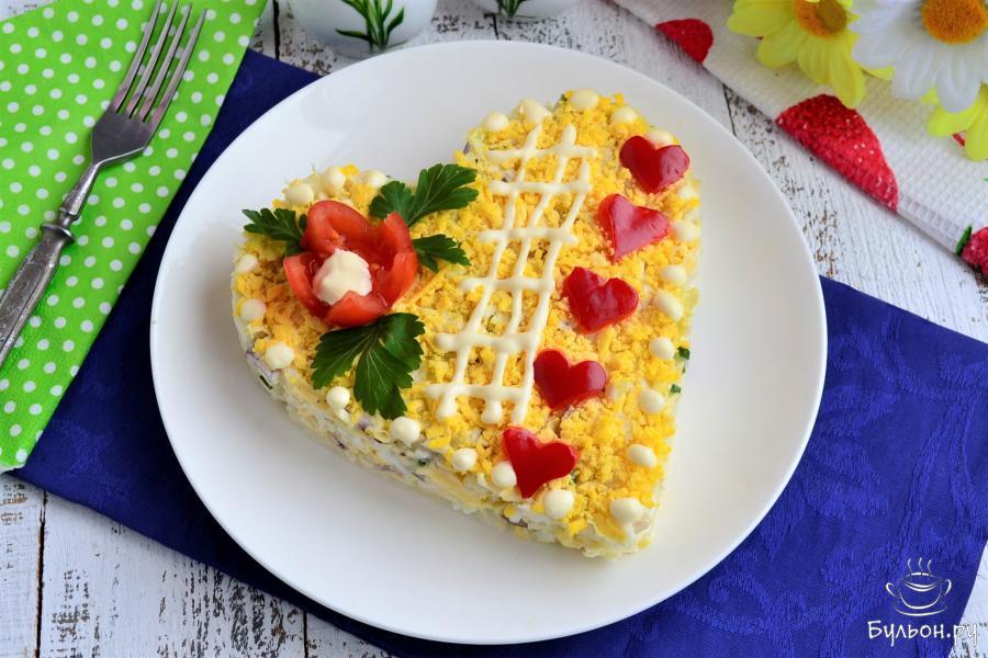 Ко Дню Влюбленных рекомендую вам подать к столу очень красивый и яркий салатик, который готовится из самых обычных продуктов. Салат получается очень вкусным, легким, но и достаточно сытным. В нем есть все: и нежность, и свежесть, и воздушность, и чуть ощутимая острота, и новизна. Салат я заправляла легким майонезом, можете заменить его на сметану. Выкладывала я его на тарелку с помощью кольца в форме сердца, можете взять и круглое кольцо или просто выложить в салатник, а сверху уже соответственно украсить.