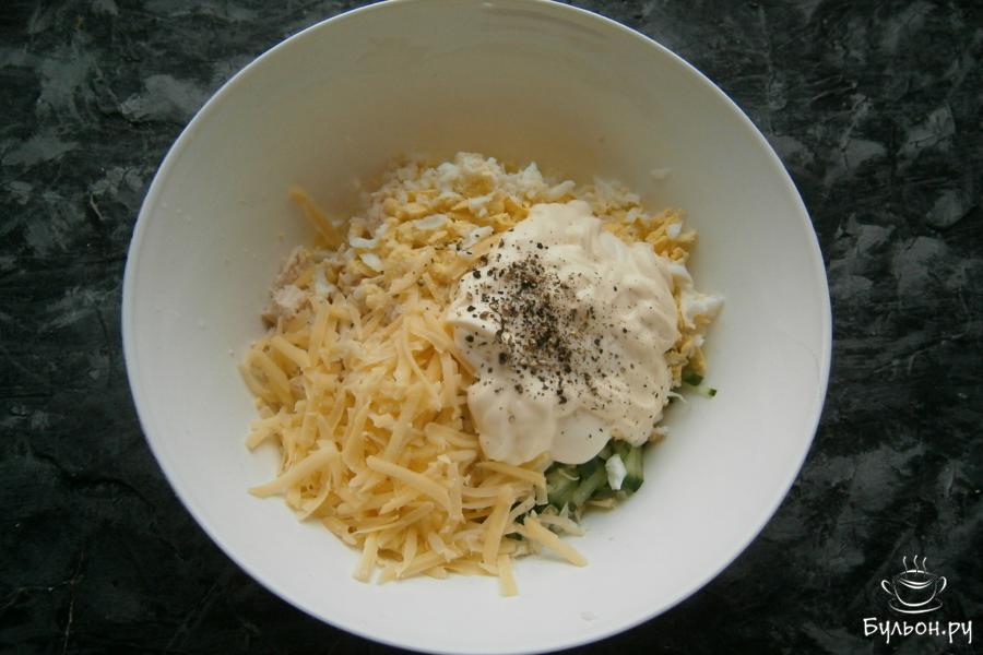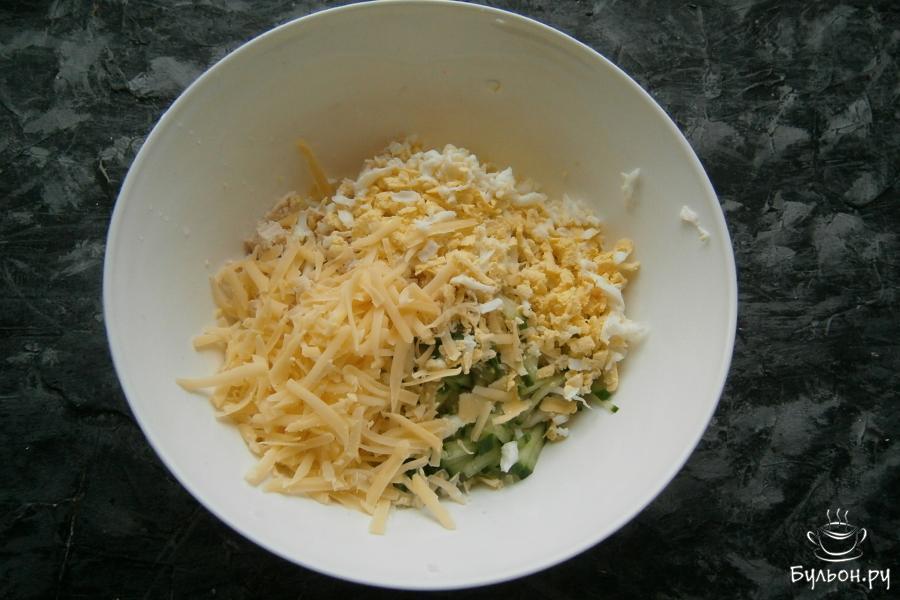 3. Сюда же, добавить тертый вкусный сыр и натертое одно яйцо. Второе яйцо разделить на белок и желток, белок также, натереть в салат, желток оставить для украшения.