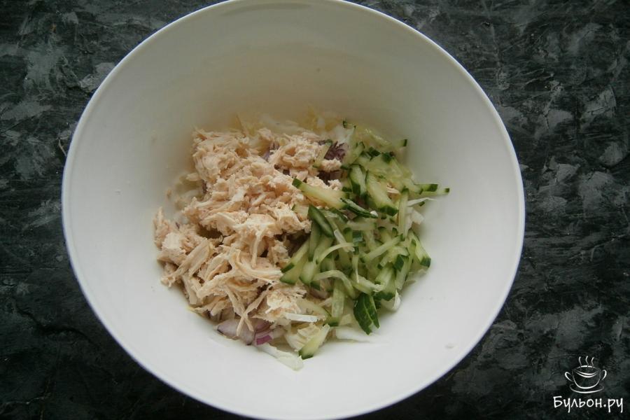 2. Предварительно сваренное куриное филе остудить и разобрать на волокна или порезать длинными кусочками. Огурец свежий порезать соломкой. Все это добавить к капусте с луком.