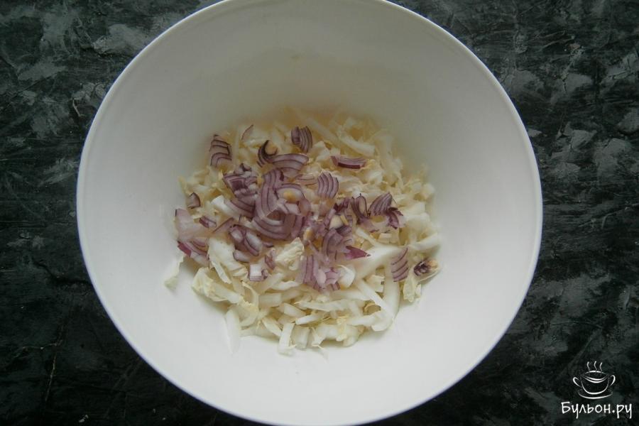 1. Яйца отварить, остудить и почистить. Пекинскую капусту нарезать тонко вдоль, а потом порубить ее, чтобы была помельче, добавить мелко и тонко порезанный красный лук.
