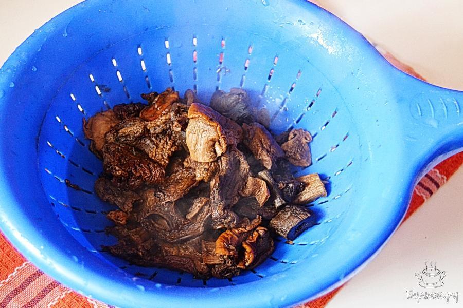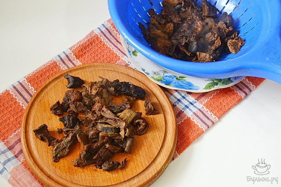 3. Сваренные грибы откинуть на дуршлаг и еще раз промыть. Воду, в которой грибы варились, процедить и в дальнейшем мы ее будем использовать для приготовления подливы.