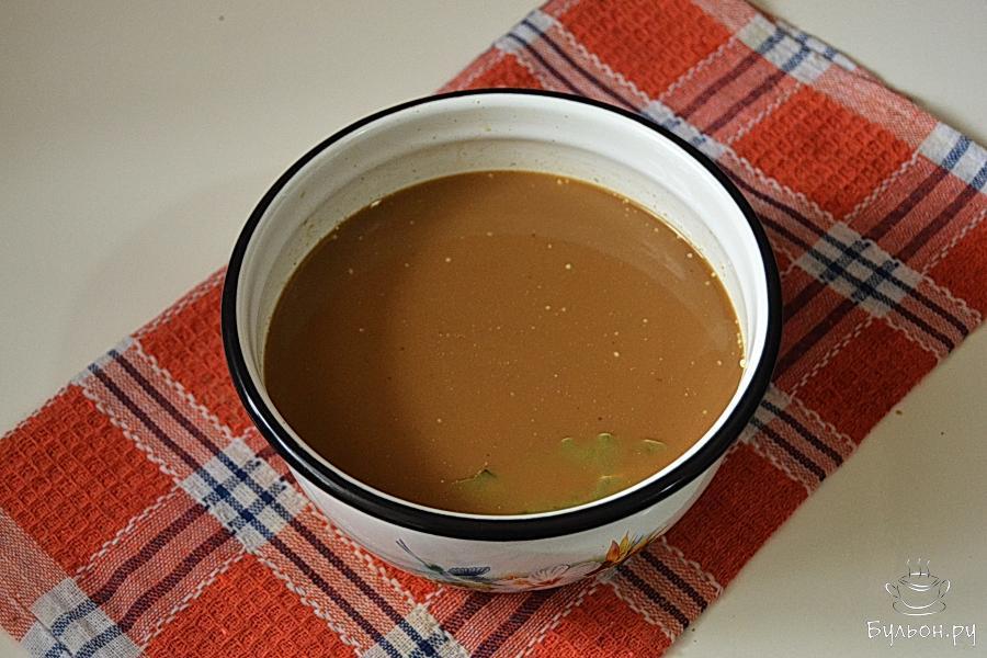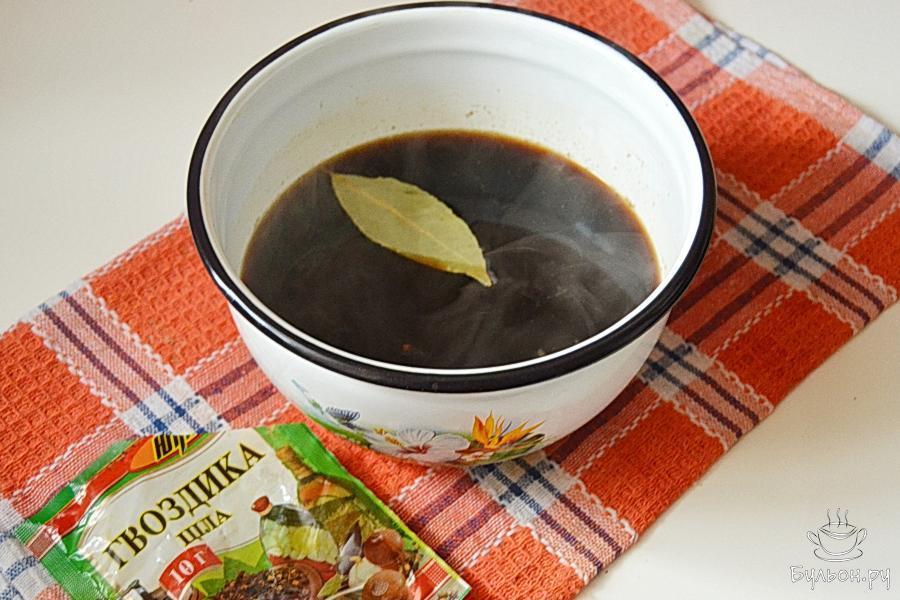 5. Грибы сложить в кастрюлю, залить бульоном, добавить лавровый лист, гвоздику, перец душистый и перец молотый. Поставить на огонь и варить при медленном кипении под крышкой.