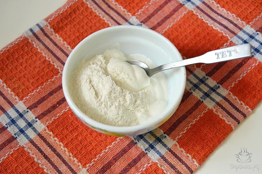 7. Остывшую муку перемешать со сметаной и постепенно добавить полстакана воды, одновременно перемешивая.