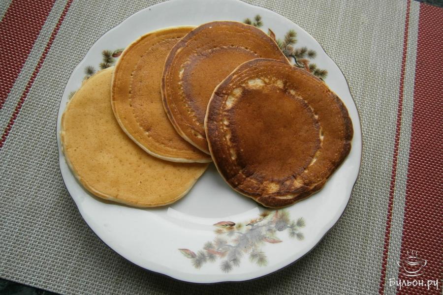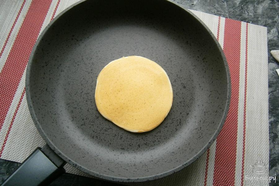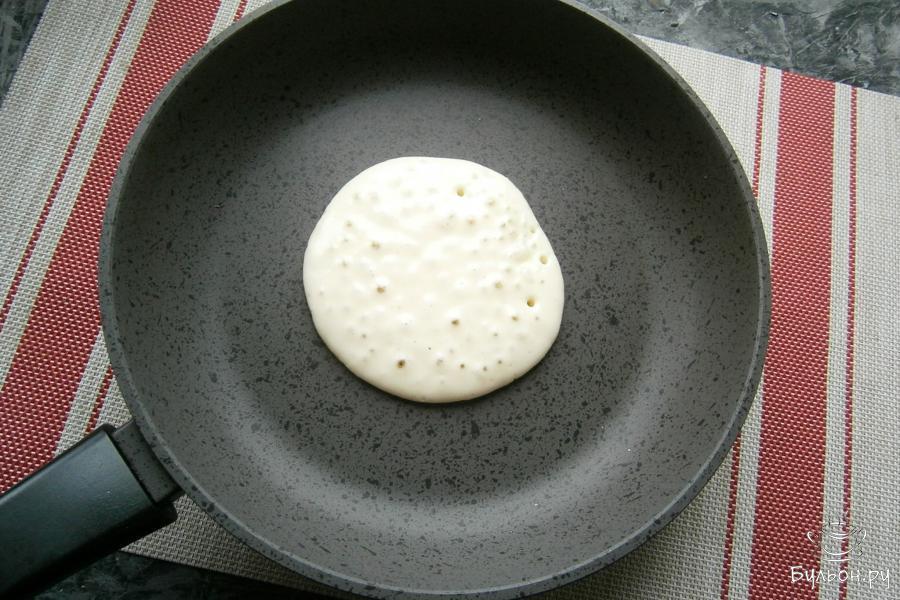5. Любую сковороду с антипригарным покрытием разогреть, в центр налить 1,5 ст. л теста, формируя ложкой круглый блинчик. Выпекать блинчик на среднем огне около 1 минуты.