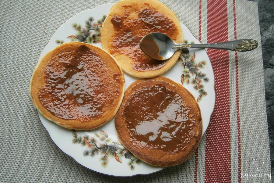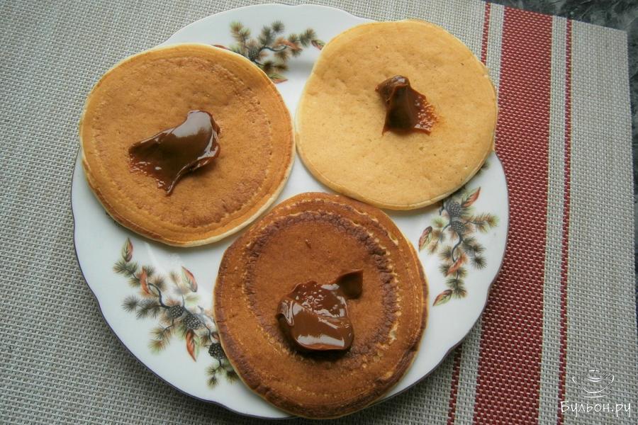 8. Блинчики разделить на равное количество попарно, т. е., если у вас получилось 20 блинчиков, разложить их по 10 шт, на которые выложить по 0,5 ч. л. вареной сгущенки.