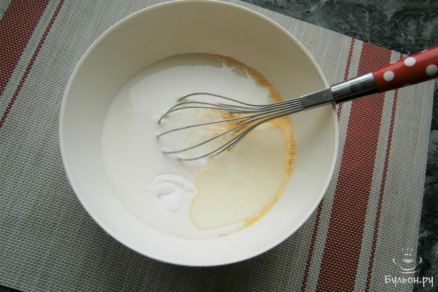 2. Расколотить все венчиком, добавить домашний йогурт, всыпать соду, влить 3 ст. л. растительного масла.
