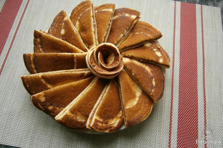 10. Накрыть эти 10 смазанных сгущенкой блинчиков сухими блинчиками (10 шт) и затем, разрезать каждый попарно сложенный блинчик пополам. Выложить блины на тарелку.