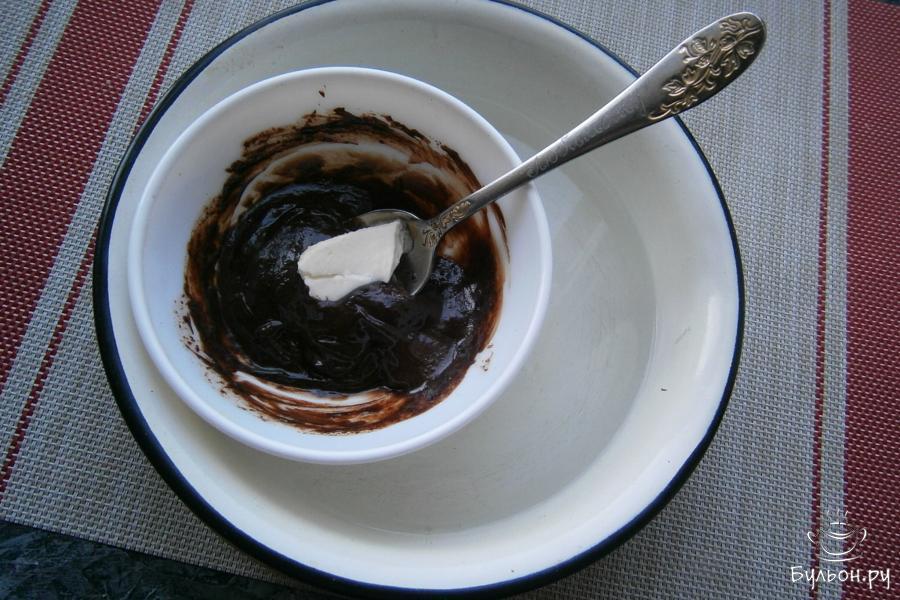 9. Растопленный шоколад тщательно перемешать со сливками до однородности, добавить кусочек сливочного масла и вмешать его в глазурь.