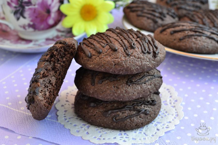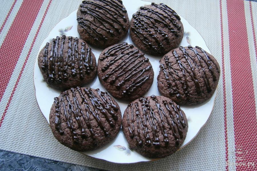 10. Глазурь остудить до теплого состояния и покрыть ею печенье в виде полосочек или сеточки. Оставить печенье в прохладном месте до тех пор, пока шоколадная глазурь застынет.