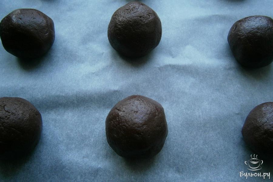 6. Тесто разделить на 10 одинаковых частей, каждую - скатать в шарик. Шарики разместить на противне, застеленном бумагой для выпечки на расстоянии друг от друга не менее 7-8 см.
