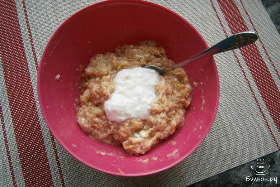 7. Влить 20 мл воды, фарш перемешать. Затем, влить в куриный фарш еще и кефир - он придаст большую сочность, хорошенько перемешать.