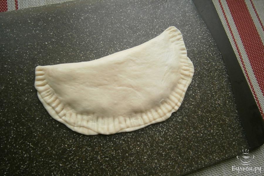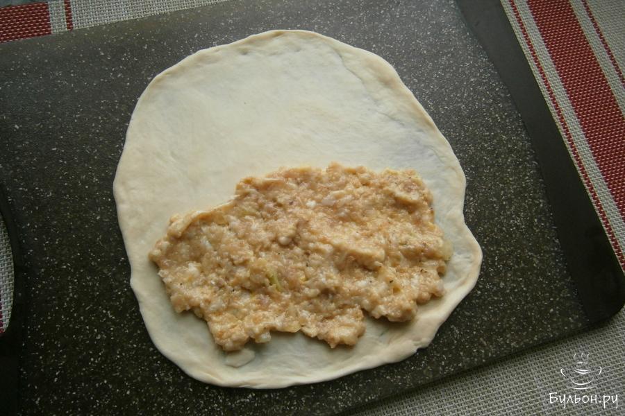 9. Каждую из частей постараться раскатать очень тонко, на половину тоненькой лепешки выложить 2-3 столовые ложки фарша.