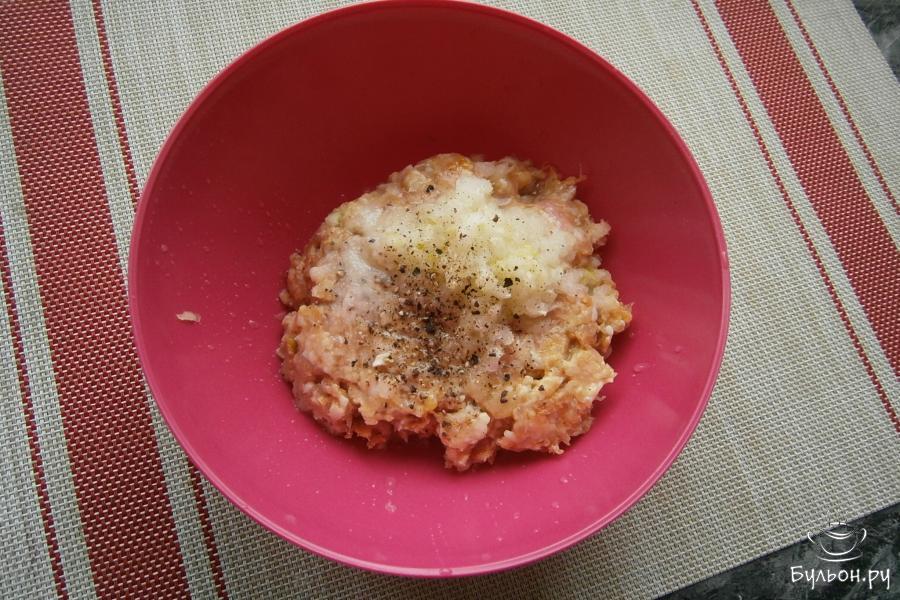 6. К куриному фаршу добавить репчатый лук, который или натереть на терке или прокрутить через мясорубку, 1/2 чайной ложки соли (или по вкусу), всыпать побольше черного перца.