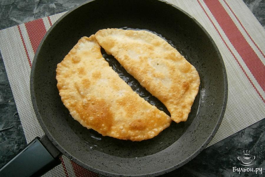 11. Теперь, чебуреки нужно пожарить в горячем растительном масле (я влила в сковороду 200 мл) до румяного цвета.