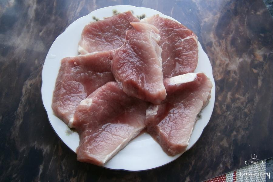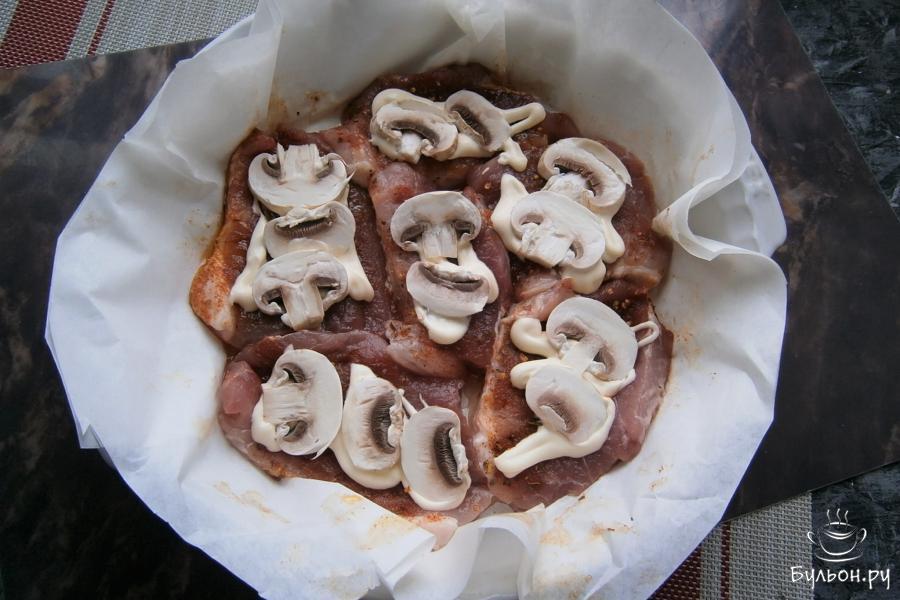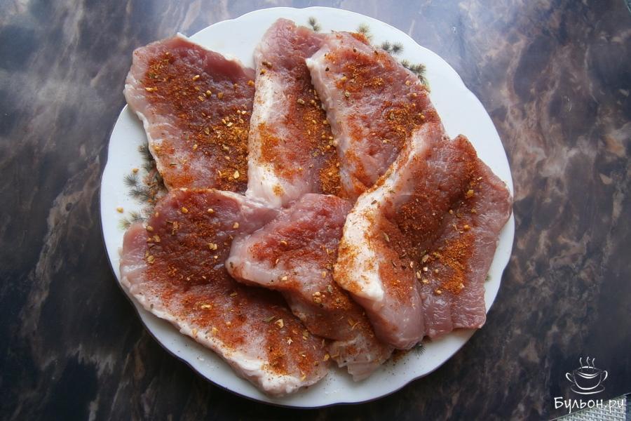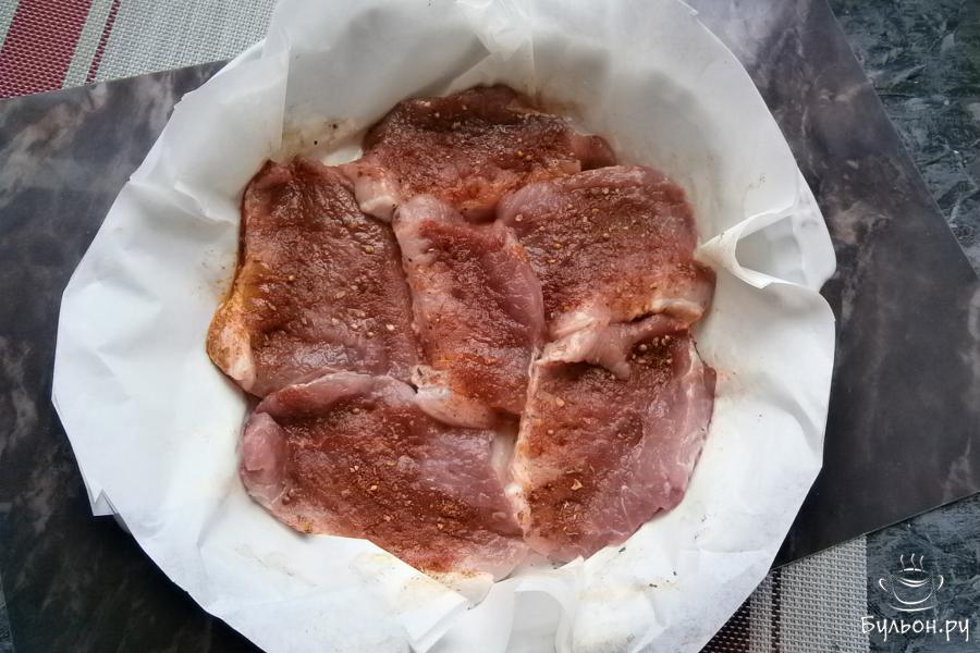 3. Форму для запекания застелить бумагой, смазать ее растительным маслом, выложить стейки свинины в один слой.