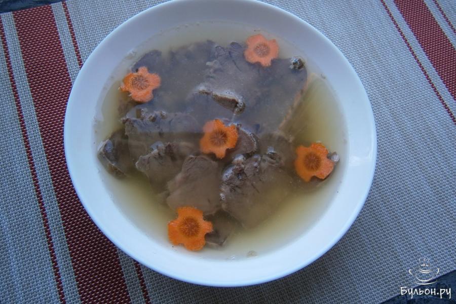 7. Ломти языка разложить красиво в тарелке и через ситечко залить его бульоном с желатином. Бульон должен только немного покрывать язык. Для украшения выложить в тарелку кружочки вареной моркови.