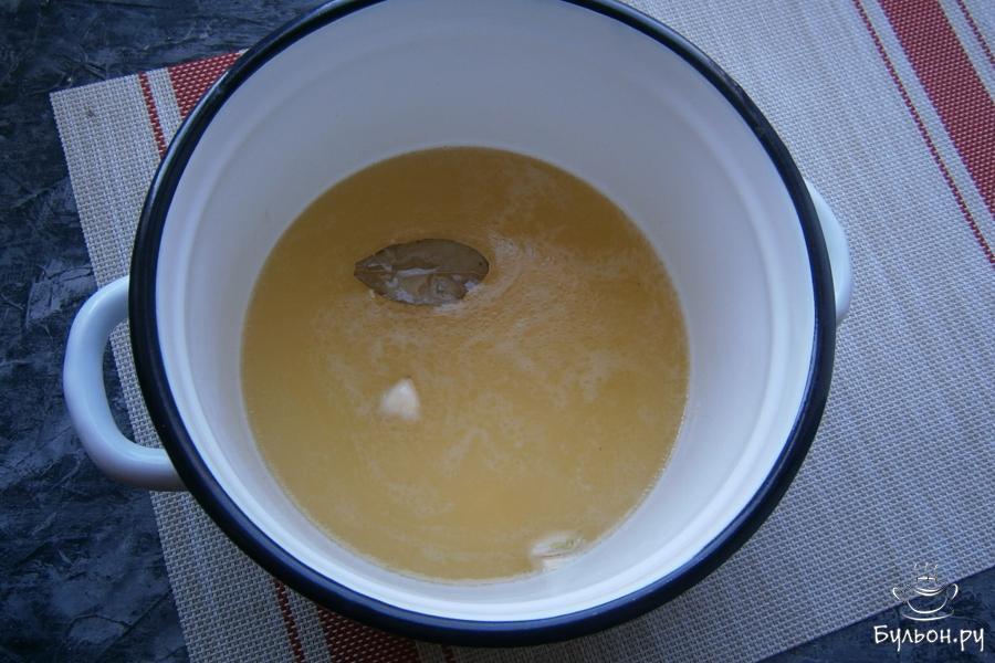 6. В бульон добавить зубчик чеснока и лавровый листик, прокипятить его 2-3 минуты. Газ выключить, а в горячем бульоне растворить набухший желатин. Дать бульону остыть до комнатной температуры.