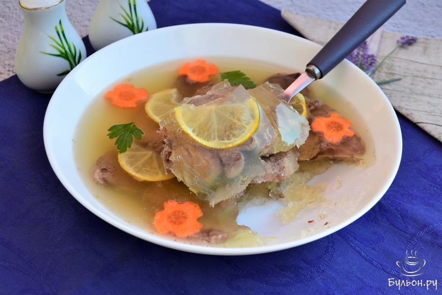 Заливное - красивое и популярное блюдо, которое часто украшает наш праздничный стол. Заливное готовят из различного мяса, птицы, овощей, грибов и т. д. Сегодня я хочу предложить вам отличный рецепт вкуснейшего заливного, приготовленного из языка свиного с добавлением желатина. Готовится такое заливное не сложно, а съедается вмиг. Свиной язык, по-желанию, можно, конечно же заменить и говяжьим, но первый, по моему мнению, нежнее. Украсить заливное можно по своему вкусу - вареным яйцом, яркими овощами, зеленью и т. п. Обязательно приготовьте это блюдо - ваши родные и гости будут в восторге.