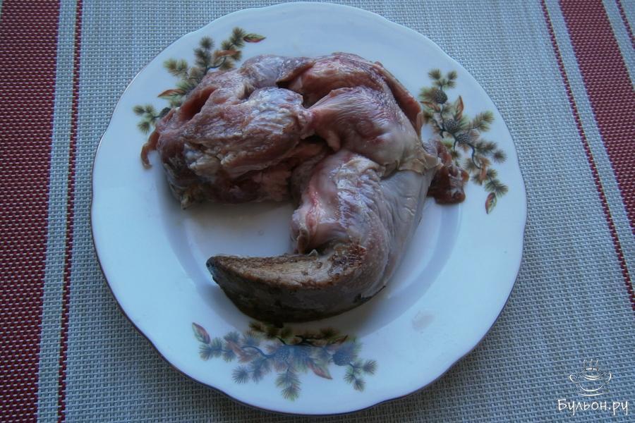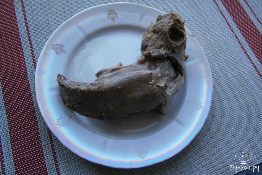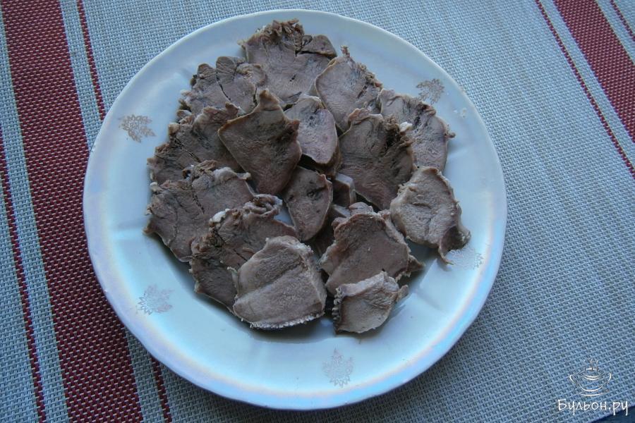 2. Снова залить язык холодной водой и также, довести ее до кипения. Убрать шумовкой всю пену, бульон посолить по вкусу и варить язык до готовности. Обычно это занимает около 1,5-2 часов. Готовый язык поместить в холодную воду, после чего очистить его и удалить все хрящи.