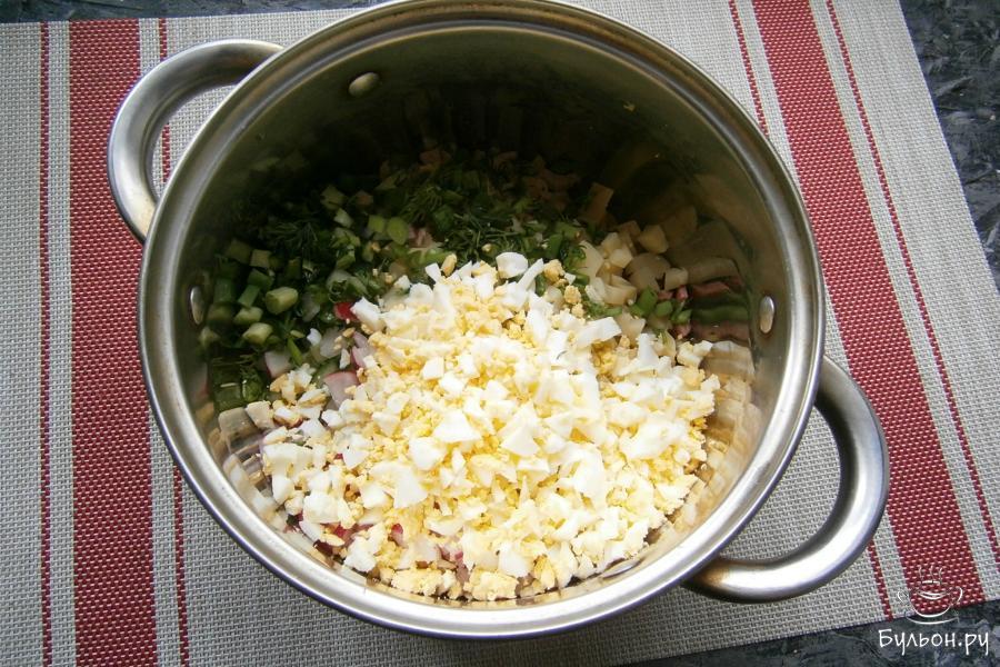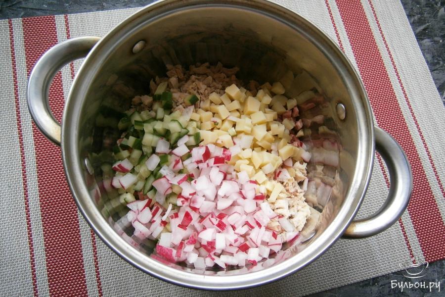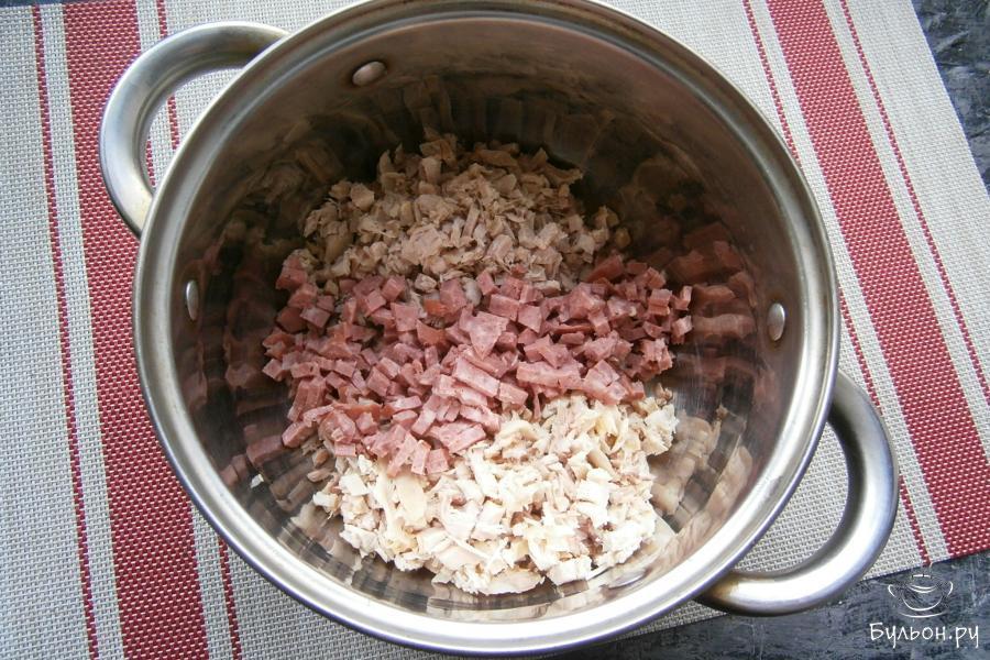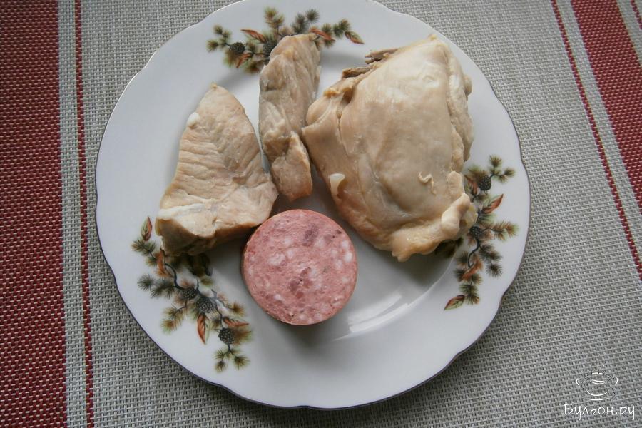 1. Предварительно отварить мясо свинины и мясо курицы, остудить. подготовить колбасу. Также, сварить и очистить картофель и яйца.
