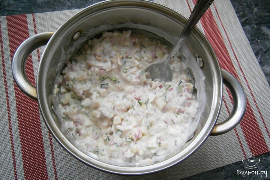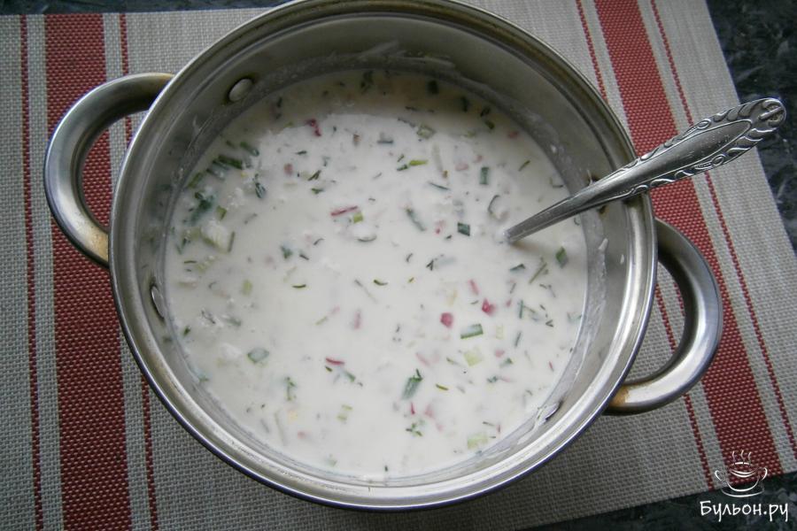 6. Далее, разбавить блюдо холодной очищенной водой, чтобы получилась консистенция супа, как вам нравится. Окрошку посолить и добавить лимонного сока по вкусу.