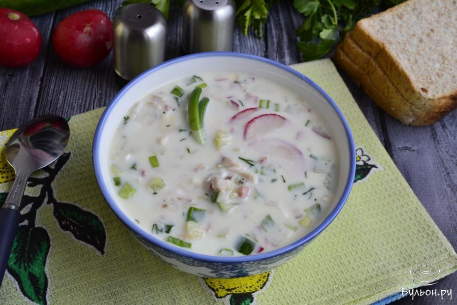 Для тех, кто любит окрошку, предлагаю попробовать блюдо, приготовленное по этому рецепту. В сборной окрошке присутствуют и курица, и мясо свинины, и колбаса, заправляется она кефиром и сметаной, разбавляется очищенной водой. Блюдо получается нереально вкусным, насыщенным, достаточно сытным, но легким и охлаждающим. Для весеннего и летнего времени года - самое то. Колбасу я использовала варено-копченую, можете заменить на любую другую, например, вареную колбасу. Кефир и сметану выбирайте с жирностью на свое усмотрение, у меня эти продукты нежирные.